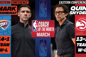 戴格诺特三月份率领雷霆取得14胜1负战绩;斯奈德率领老鹰取得13胜2负战绩。